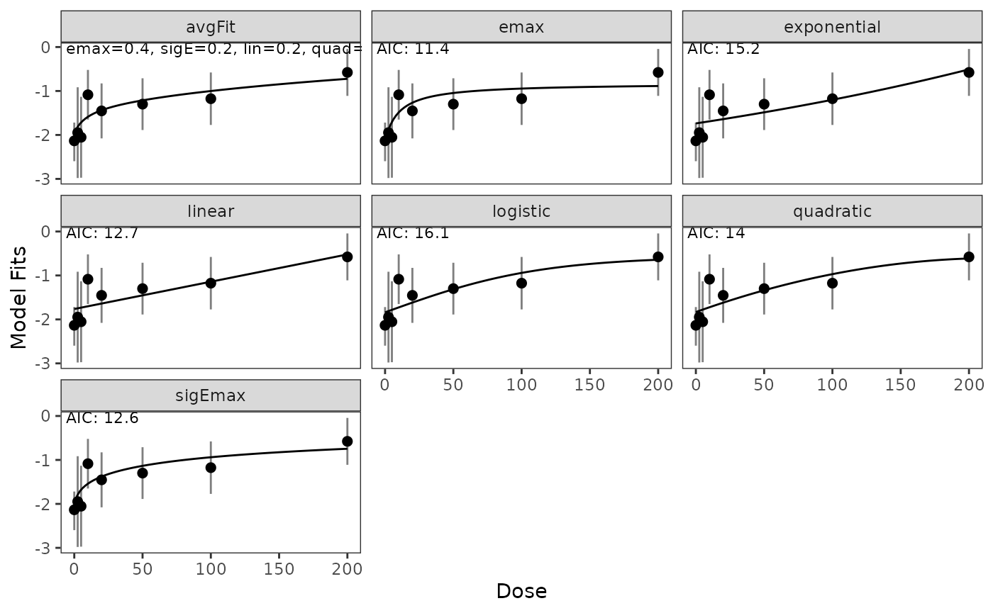 #> Significant 1 1 1 1 1 1The testing step is significant, indicating a non-flat dose-response shape. All models are significant.