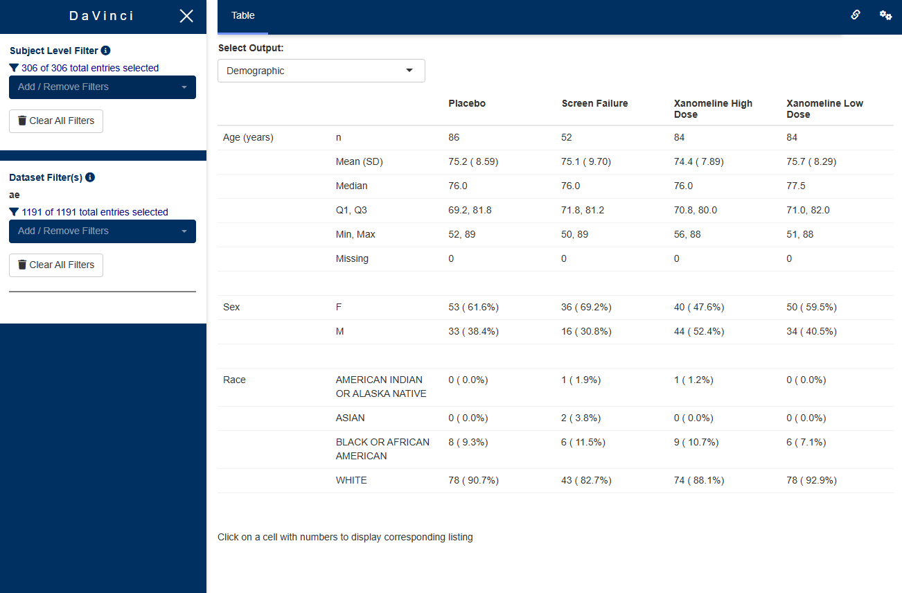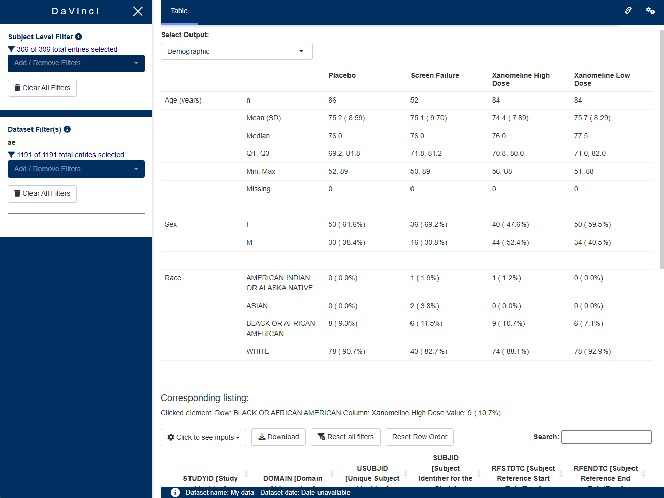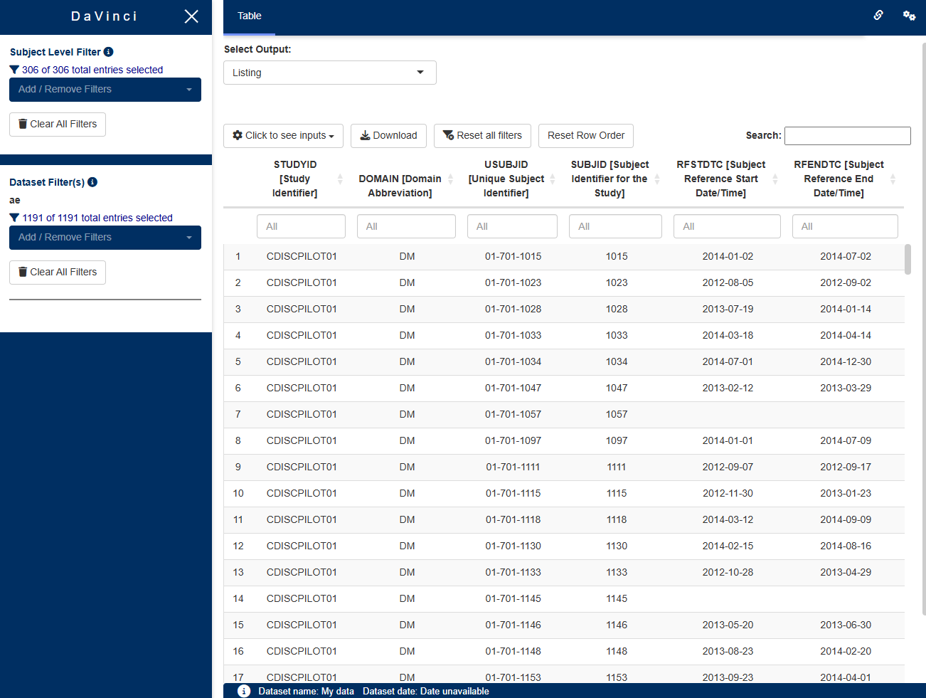 The listings module displays arbitrary datasets as listings. Users can select the dataset to be shown, and specify which columns of the dataset should be displayed as well as their order. The displayed columns can be sorted and filtered. Moreover, the table can be filtered to show only entries containing a keyword entered by the user. The module is not limited to usage of one data source, most notably, it can handle data from ADaM or SDTM.
