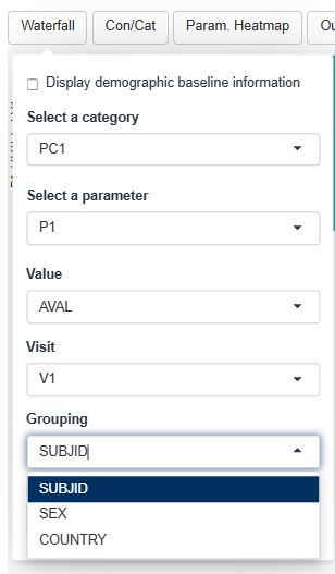 The ADaM Basic Data Structure (BDS) using PARAMCD is used to store parameter values for a given subject across several visits. Any of these parameters can be selected to be plotted in the waterfall.