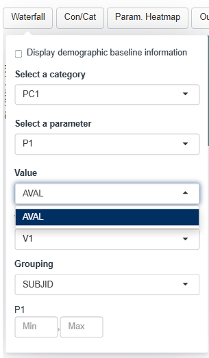 - The Parameter dropdown will contain all the factor levels in the PARAM column whose corresponding PARCAT1 is selected in the Category menu.