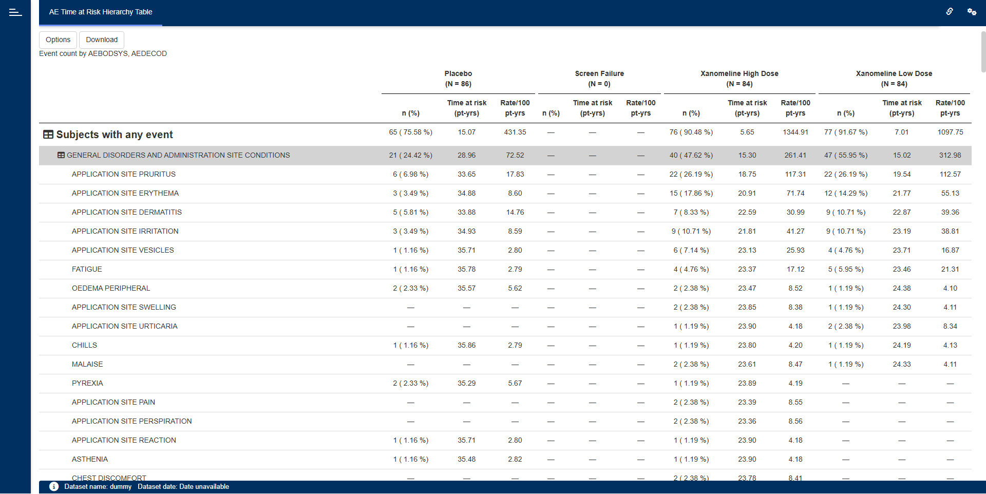 "AE Time at Risk Hierarchy Table" = dv.tables::mod_hierarchical_count_table(